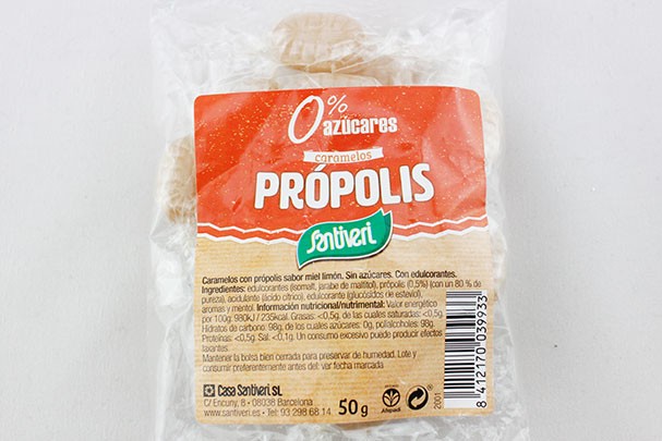 Ingredientes: Edulcorantes (isomalt, jarabe de maltitol), própolis (0,5%) (con un 80 % de pureza), acidulante (ácido cítrico), edulcorante (glucósidos de esteviol), aromas y mentol.
