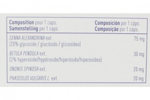 Ingredientes: aceite de soja, gelatina, extracto de Senna alexandrina (sen, hoja 15%), gelificante: glicerina, extracto de Betula pendula (abedul, hoja (6%)), agente de carga: sorbitol, extracto de Ononis spinosa (gatuña, raíz (4%)), extracto de Phaseolus vulgaris (judía verde, fruto (4%)), emulsionante: lecitina de soja, estabilizador: dióxido de silicio.