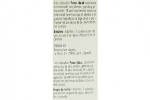 Propiedades: Las cápsulas Peso Ideal contienen extractos de sen, abedul, gatuña y judía verde. El sen sostiene el tránsito intestinal mientras que el abedul y el gatuña beneficia la digestión y promueve los procesos de detoxificación del cuerpo.