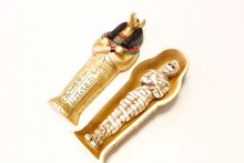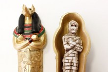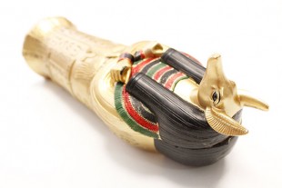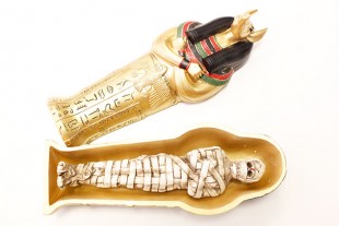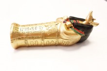 Figura de sarcófago Anubis dorado y decorado con momia en su interior.