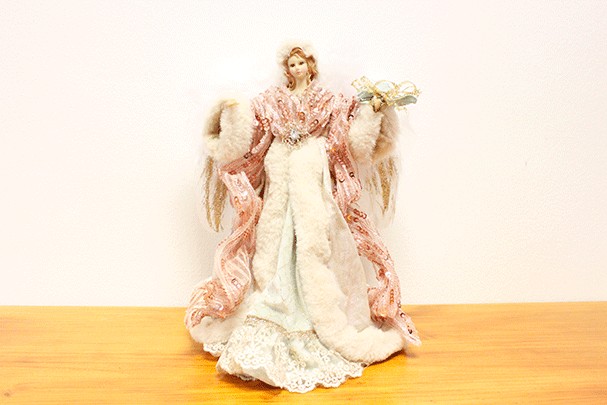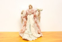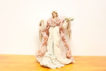 Bonito Ángel dorado de 28 cm de altura con preciosos detalles de plumas, pelo, lentejuelas y puntillas y bordados dorados. No puede faltar en tu lugar sagrado.