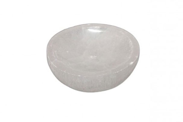 Cuenco de Selenita redondo, tamaño pequeño. Puedes usarlo para depositar tus minerales o cualquier objeto, ya que la selenita aporta carga y alta vibración, armonía y transfiere al ambiente armonía.
