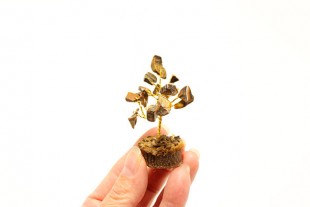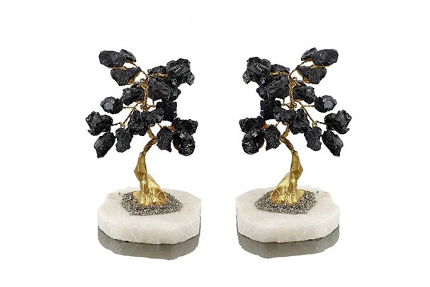 Árbol con trozos de turmalina en bruto de aproximadamente 1cm de tamaño. El troco del árbol esta creado con alambre dorado y las ramas del mismo están formadas por masivos de turmalina negra con un brillo inmejorable.