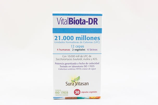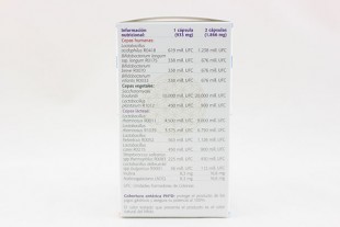 Propiedades: Combinación potente y avanzada de 12 cepas bacterianas seleccionadas (4 humanas, 2 vegetales y 6 lácteas). Además contiene S. Boulardii, F.O.S (Achicoria) y A.O.S (alerce). Aportando un mínimo de 21.000 millones de bacterias viables por cápsula con cobertura entérica PH5D a base de agua, para una óptima protección frente a las secreciones ácidas, regenerar la flora intestinal, aumentar nuestro sistema inmune y de ayuda en la pérdida de peso.